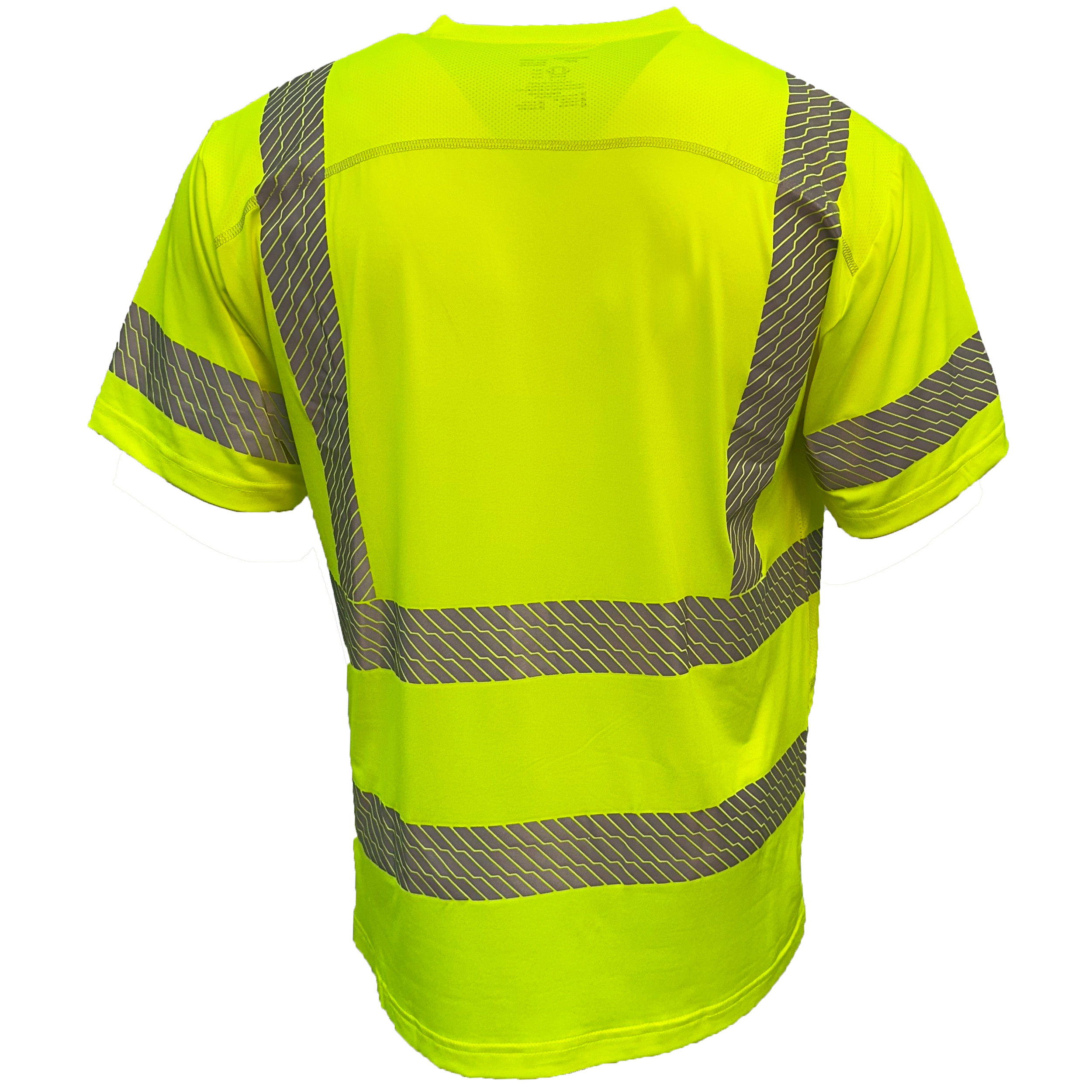 Premium athletic-type short-sleeved shirt, high-visibility safety yellow/green self-wicking high-performance stretch polyester/spandex microfiber, breathable mesh material on the upper back and sides, segmented silver reflective material, UPF 15+ protection. ANSI class 3, ANSI HVSA type R.